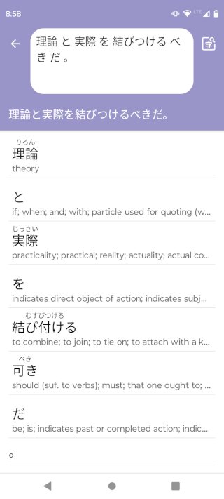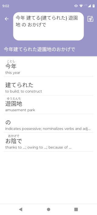 There’s a new screen that lets you input a body of text and output a list of JMdict entries for every word found. You can access this screen from the main menu.